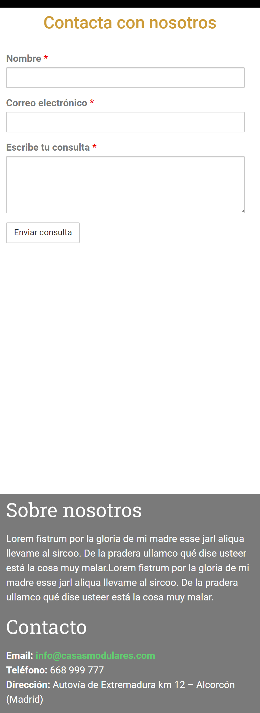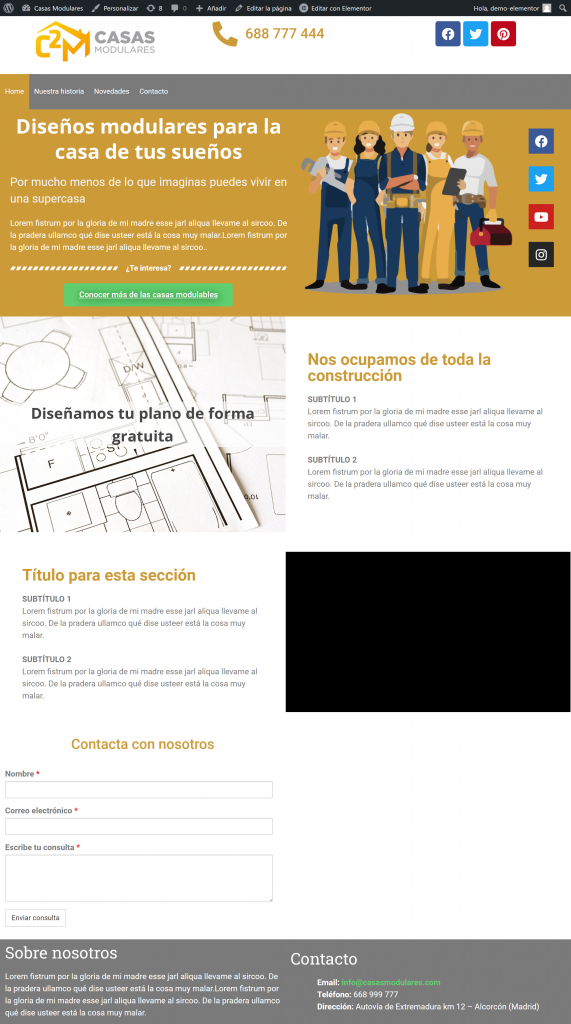 El siguiente proyecto que se hizo en WordPress es la página de diseños de casas modulares. Se puede ver que en el menú al desplazar el cursor por encima, este cambia de color. También se puede ver como he personalizado el pie de página.