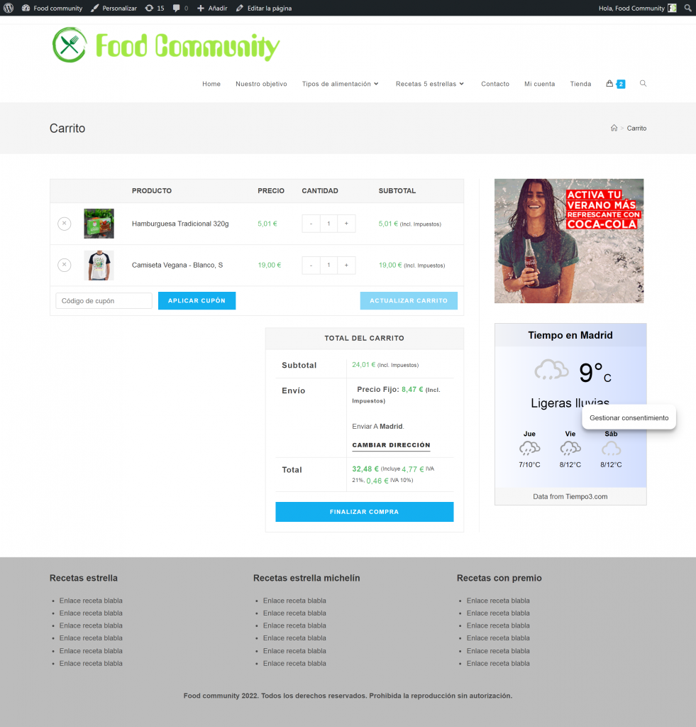 Tenemos una imagen para ver que el plugin de compra funciona correctamente, y que en el carrito están los productos seleccionados con el IVA correspondiente.